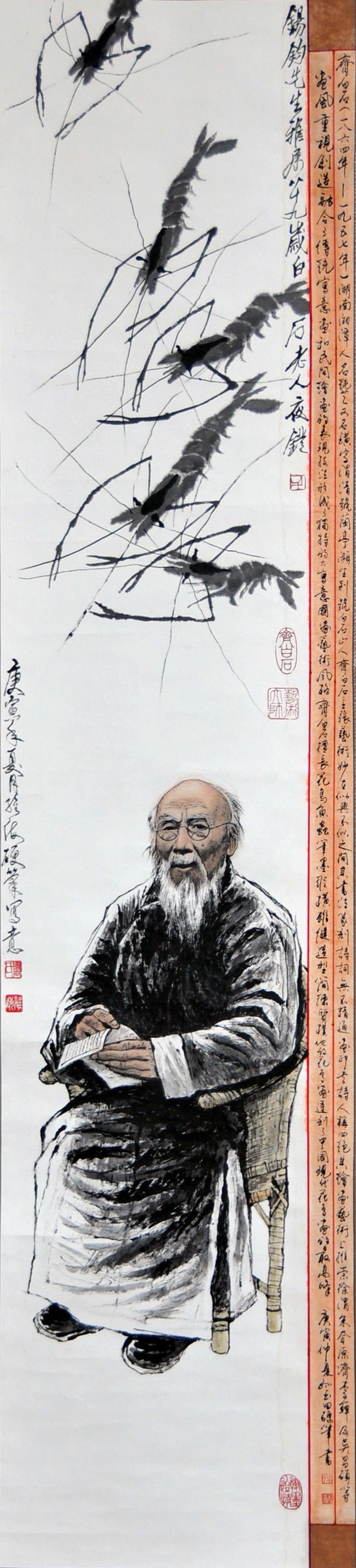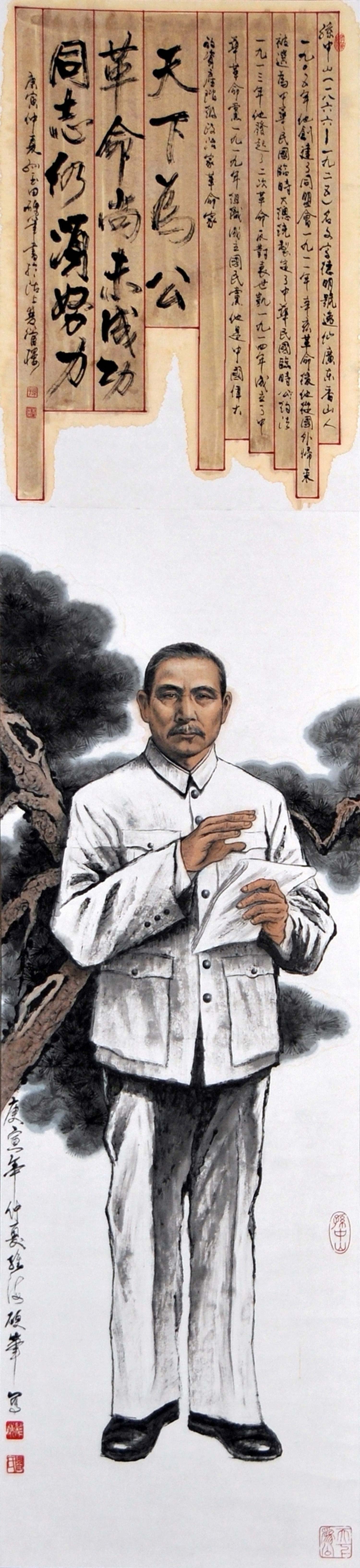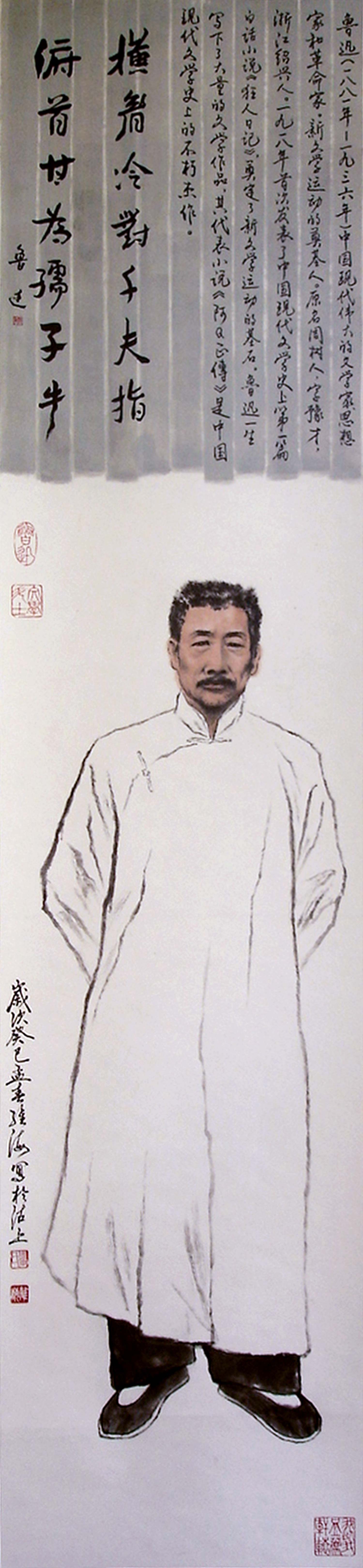 在閻維海先生的畫中折射出一道思想和藝術相碰撞的火花,尤其是欣賞他創作的專題人物系列畫。偉人系列如孫中山等,文學巨匠 系列如魯迅等,大儒高僧系列如李叔同等,更能品味出其思想性和藝術性的魅力。閻維海先生作畫與他人不同,他繪畫先思后行,尤以心運筆,筆隨心動。他畫一幅 畫所思考的時間遠遠超過繪畫所用的時間,他筆下的每一位人物都是經過深度揣摩、分析、研究所畫人物的思想、性格、品格等成熟后的佳作,所以他筆下的人物都 含蘊豐富,傳神達意。他筆下的《孫中山》深刻而形象的塑造了一代偉人的風采,充分展現 了孫中山先生“天下為公”的襟懷,也流露出“革命尚未成功,同志仍須努力”諄諄囑托的神情;《魯迅》一畫則給人一種震撼的力量。閻維海先生把魯迅那種“橫 眉冷對千夫指,俯首甘為孺子牛”的灑脫、謙恭的革命家的風骨表現得惟妙惟肖,令人呼之欲出:《弘一法師李叔同》畫中則把一代宗師的淡定和深邃的韻致展現得 淋淋盡致,生動傳神。這是他天賦靈性的體現,更是他藝術功底的積累所致。