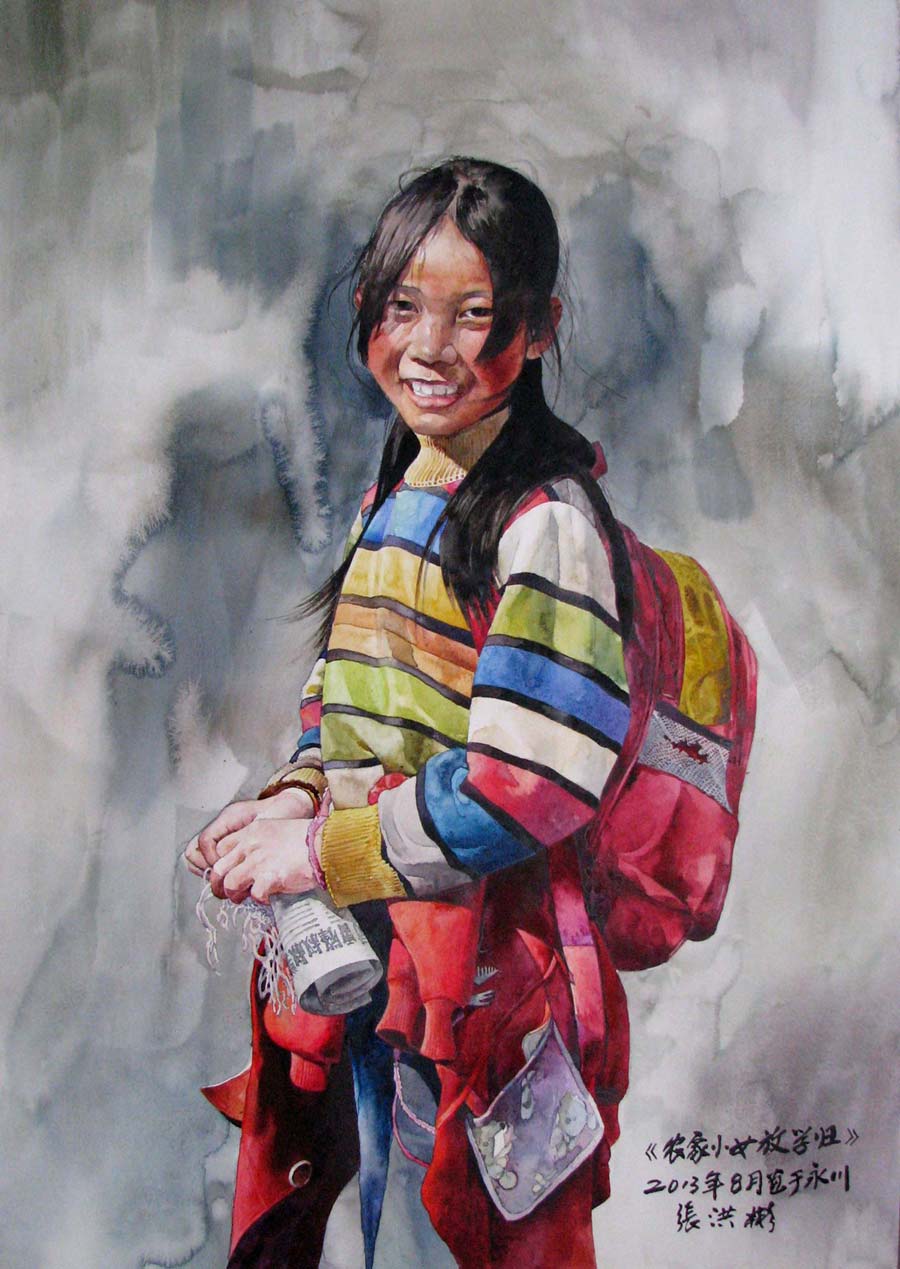 水彩《農(nóng)家女孩放學(xué)歸》76×53cm 2013年