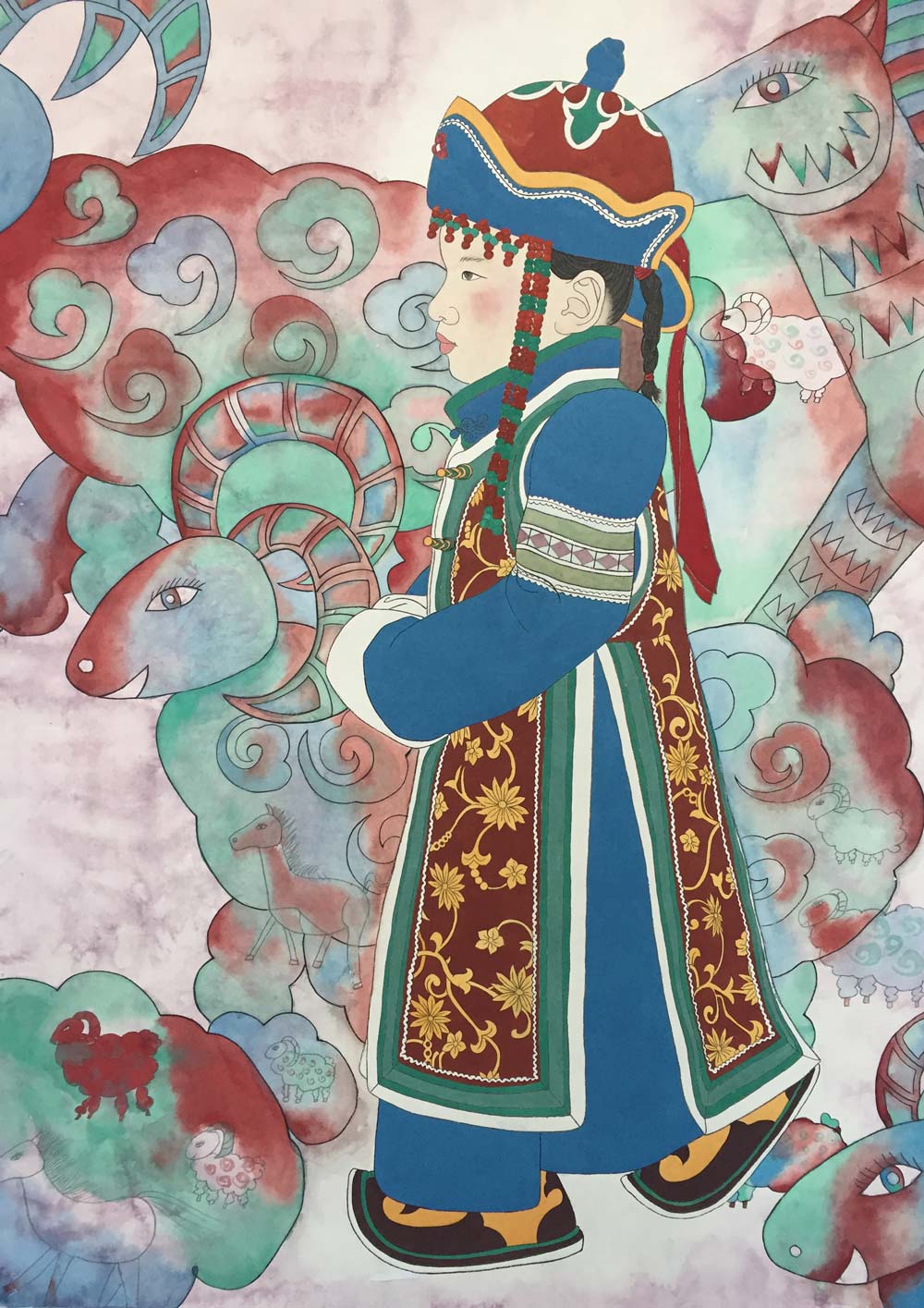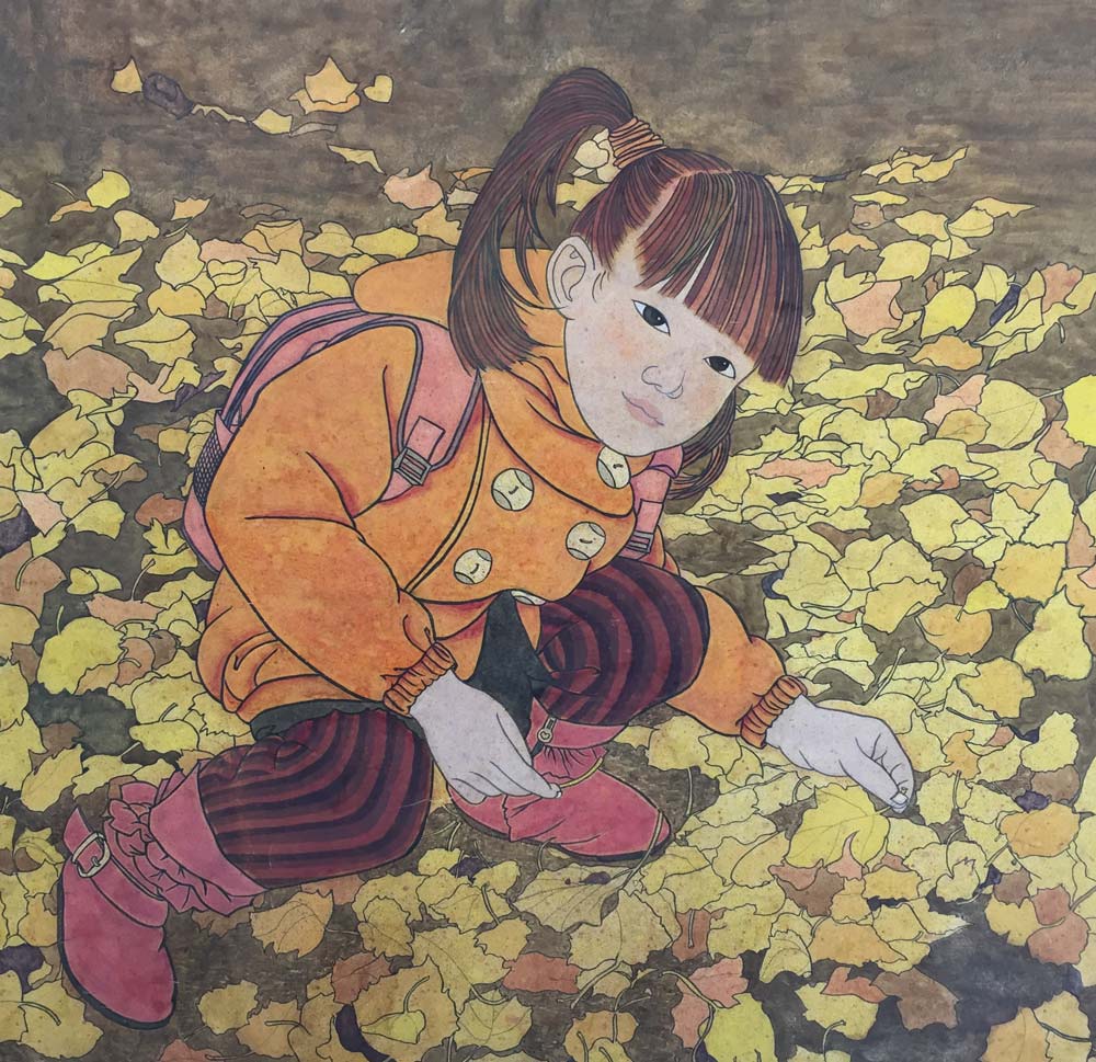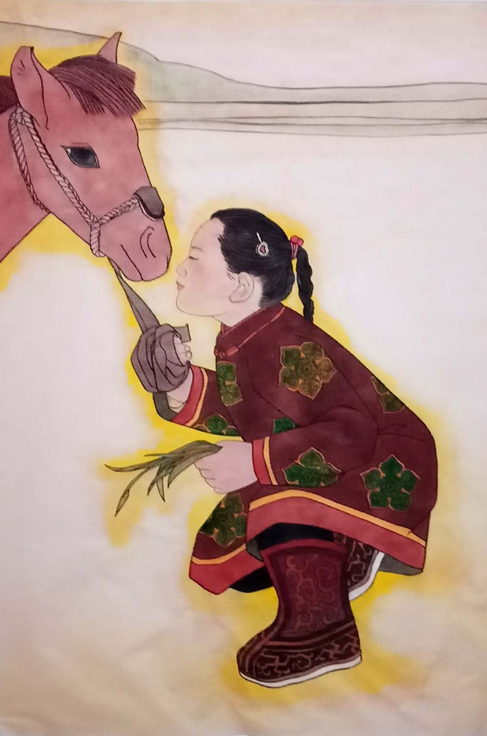 內(nèi)蒙的畫家,大多取材于草原,畫草原、畫生活在草原上的牧民。她沒有盲目跟風,她雖然生活在內(nèi)蒙古卻不了解草原,對草原、對牧民沒體驗沒有更深刻的情感。她關(guān)注她的學(xué)生。她熟悉他們了解他們,關(guān)愛他們。因此她的“種子系列”中的孩子們單純、可愛、一派天真。絲毫沒有死搬照片的做作、生硬和概念。畫中造型稚拙,刻畫細膩,畫面唯美。從她的作品中能讀出她對孩子們的那份情感和愛。