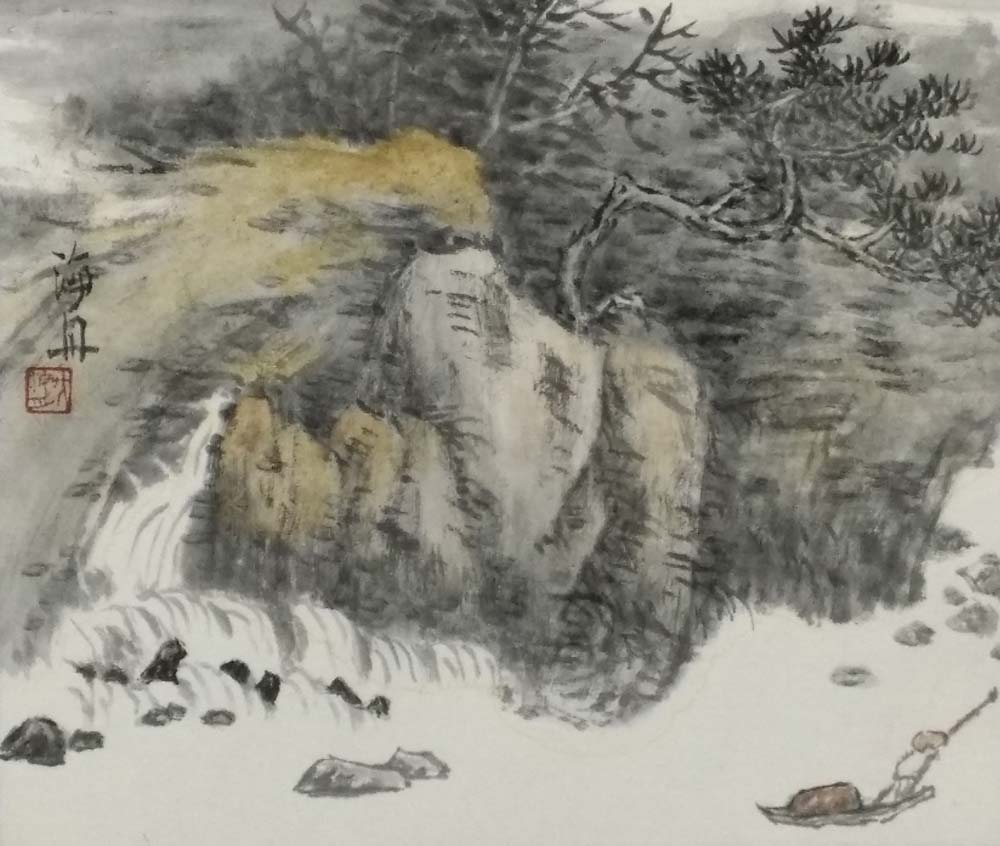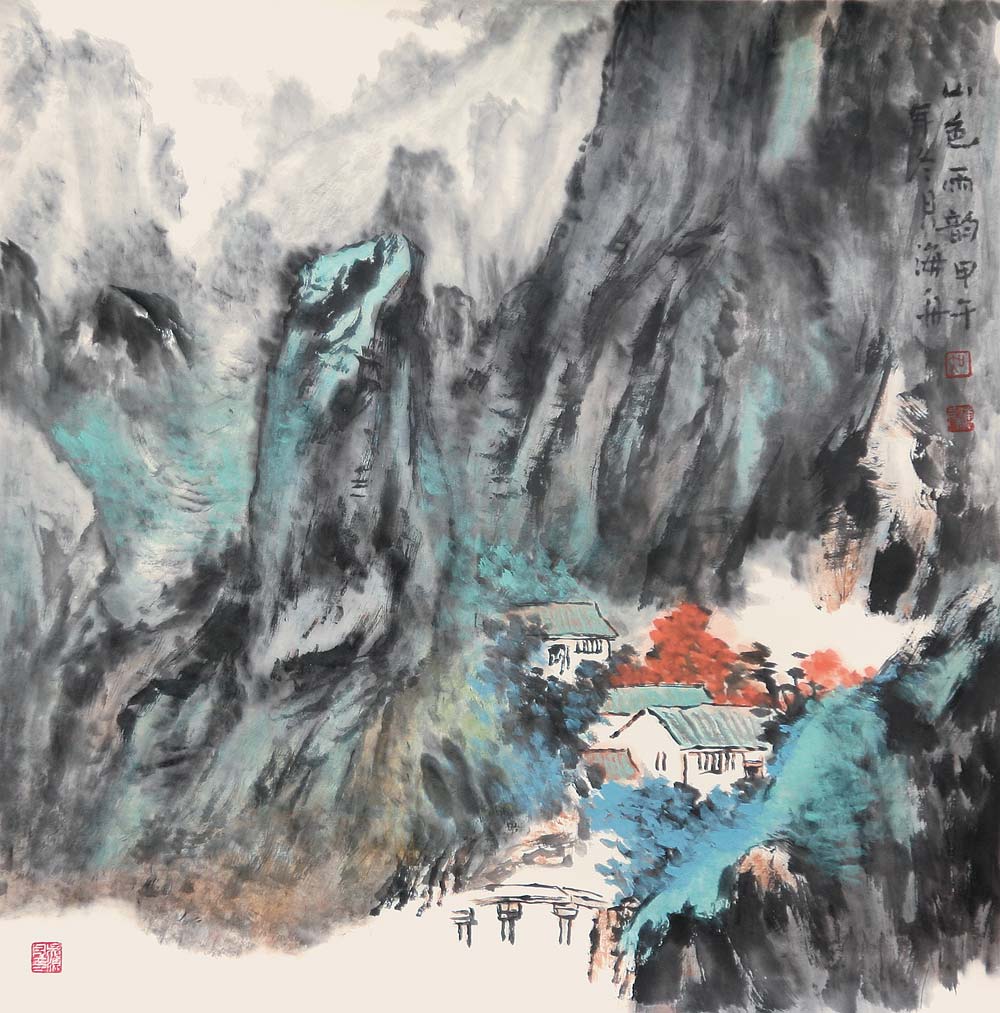 家國,永遠是一個關乎生命意義的人文話題,家國、故土永遠是每個人的精神歸宿。吳海舟的畫滿載著深情的鄉愁。久居他鄉,苦思故鄉。吳海舟的鄉愁,反復穿梭在他鄉與故鄉之間。擼住出竅的靈魂,拷問結滿老繭的心。如何尋覓逝去的足跡,尋覓當年萌動的初心?這是他一直苦苦思索的內容。借由藝術創作,吳海舟的創作方向由對自然風貌的描繪,轉向對人文精神的挖掘,這是他精神上的一次還鄉。在與心靈的深度對話中,吳海舟在這方曾是熟識但久已疏離、曾給他以生命和藝術理想的故土家園中尋覓和實現著一種心靈上的撫慰和寄托,并獲以在山水畫表現上的一次升華。