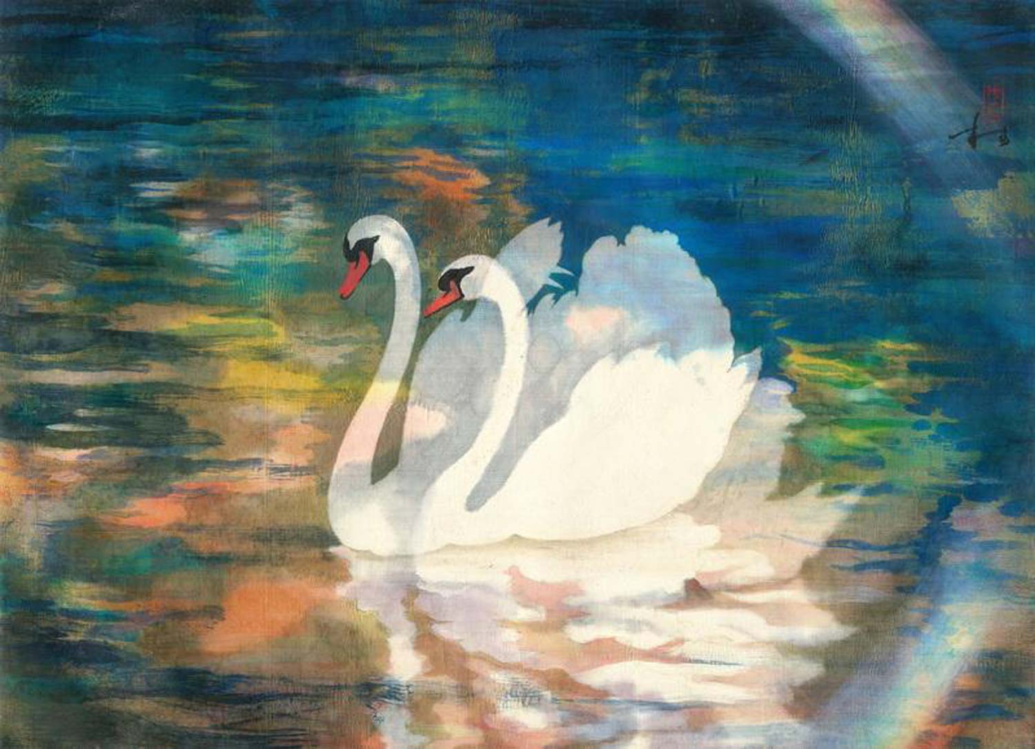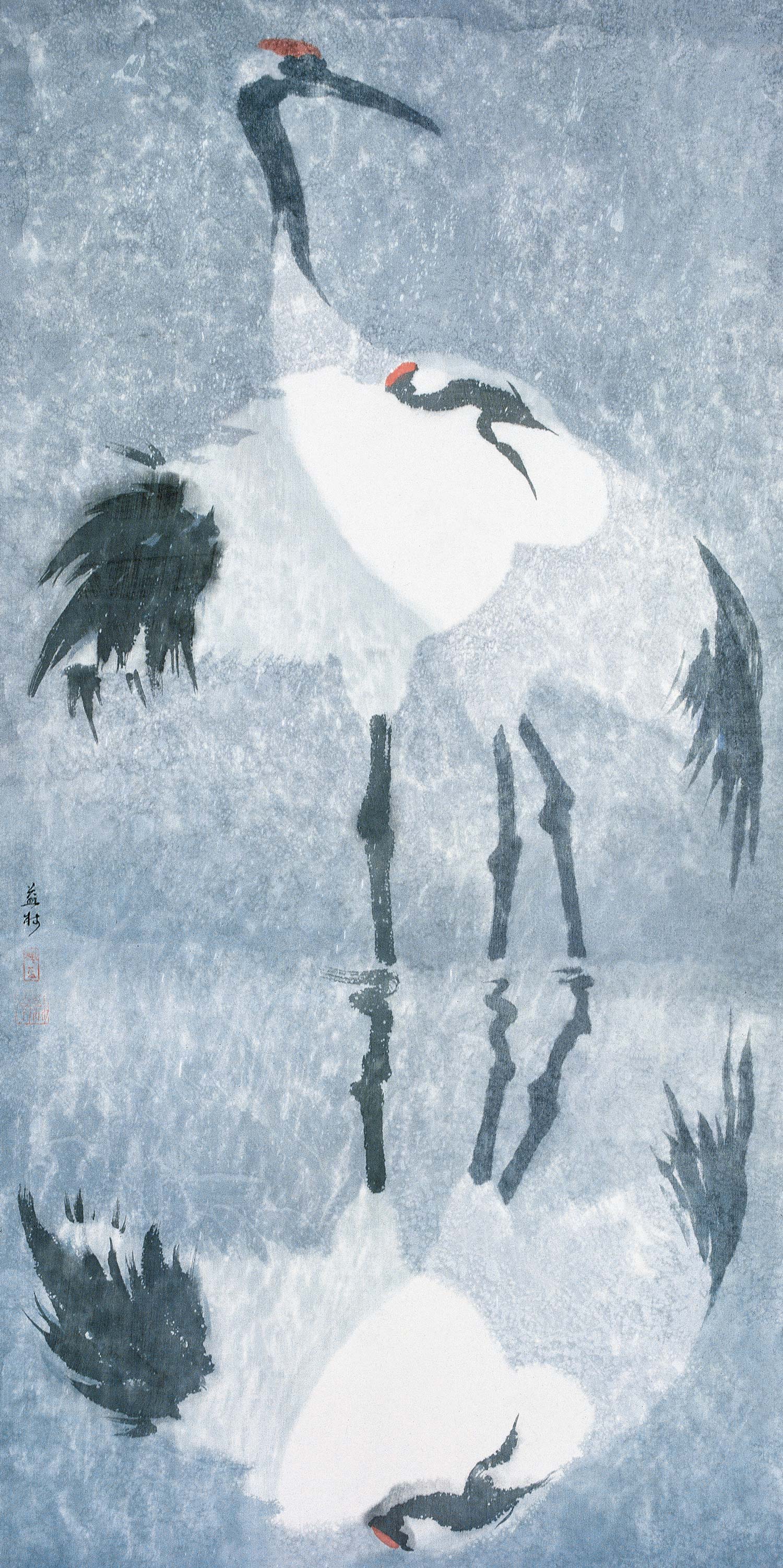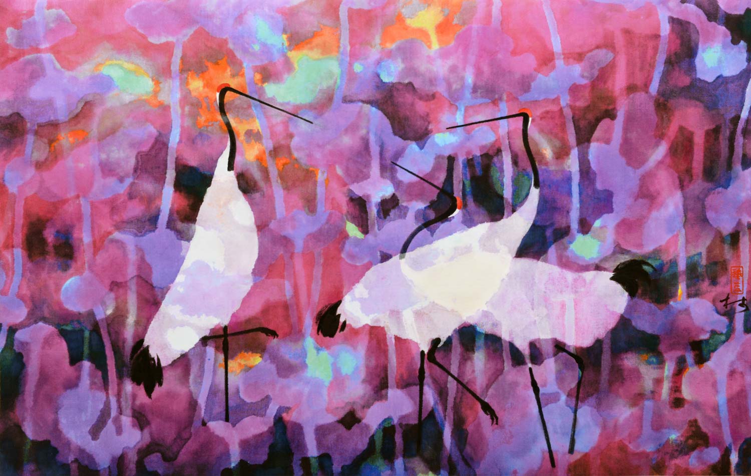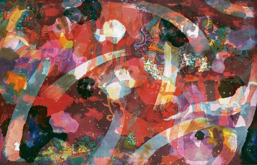 穆益林的藝術成就遠不在對古代帛畫技法的硏究上,而主要表現于他的帛畫創新探索成果。他深知,古老帛畫技法的復興,必須結合新的藝術實踐,做“以古開今”的努力,方能達到應有的社會影響。他從熟悉帛畫質材、技能特性入手,不斷發掘新的輔助性材料,嘗試不同顏料混合使用或前后配合使用的方法,深入探索帛的正反兩面采用不同顏色、不同形象,以相互折疊的形式進行創作,使帛畫隨著觀賞者的不同角度和光源的變化,顯示出畫面變化無窮的奇異色彩和帛的肌理色澤。在此基礎上,他進一步從題材、技法品種和和表現語言方面拓展帛畫的表現范疇,使之不僅能自如地采用工筆、寫意、沒骨等方法描寫人物、花鳥、山水,更從現代審美意識出發,廣泛地從其它民族傳統藝術、西方現代藝術和民間藝術中吸收營養,并發揮藝術創造中應有的潛意識功能,在縝密構思的“有意”和偶然效果的“無意”之間,在具像、抽象、意象語言的交錯運用中,馳騁自己的才能,享受藝術探索的無限樂趣,創造出不少以色彩飽和度為特點的、富有強烈藝術表現力的現代帛畫佳作,如《鬧元宵》、《元宵印象》、《天涯客》、《天地皆詩系列》等。透疊法是穆益林在帛畫中運用得最為廣泛,也是最為熟練的一種表現手法,甚至可以說是他的帛畫藝術的符號。在傳統的繪畫語言中,重疊的圖式是對圖中形象的主、次關系的一種表達。而透明性使傳統意義上的主與次的等級關系被打破了。透疊法可以說是由新材料帶來的新技法,其平面性和虛幻性是現代藝術的典型特征。穆益林在《天涯客》系列和《荷塘印象》系列中,將透疊法發揮得淋漓盡致,交錯重疊的丹頂鶴或翩翩起舞,或昂頸高歌,虛幻的圖像里充滿了詩情畫意。而滿塘的荷花層層疊疊,在天光水色之間漂浮,線與面奏起的是一支支幽靜的小夜曲。